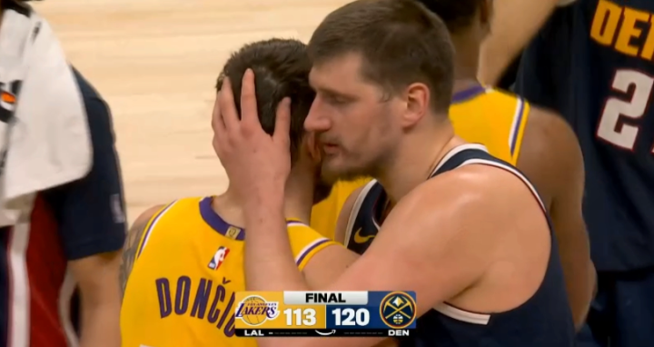 赛后詹姆斯第一时刻离场复返更衣室,东契奇与约基奇、穆雷等东谈主拥抱问候后失意离场。