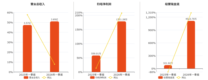 公司贸易总收入为3.85亿元。归母净利润为1721.28万元。方向作为现款净流入为4510.70万元。