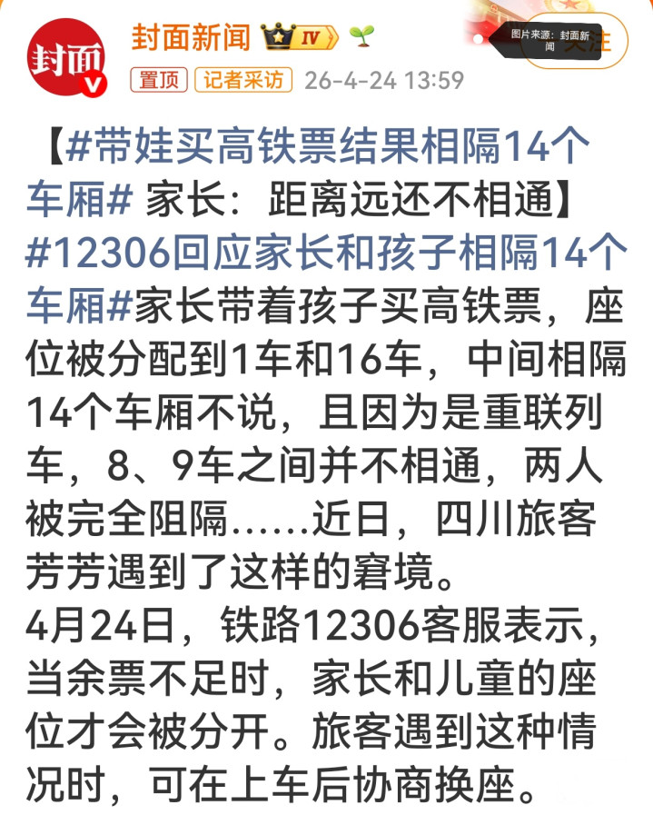 具体来说,四川游客芳芳带娃购票时,因为余票不及,出现了家长和孩子座位相隔14车厢的情况。这种“不测”如实会让家长一时犯难,但铁路部门给出的管束决议很接地气:上车后和其他游客协商换座。其确凿高铁上,这么的暖心配并吞不稀有,好多游客遭遇肖似情况,都会主动伸出扶植,帮带娃家长或有需要的东说念主诊疗座位,让出行更顺畅。