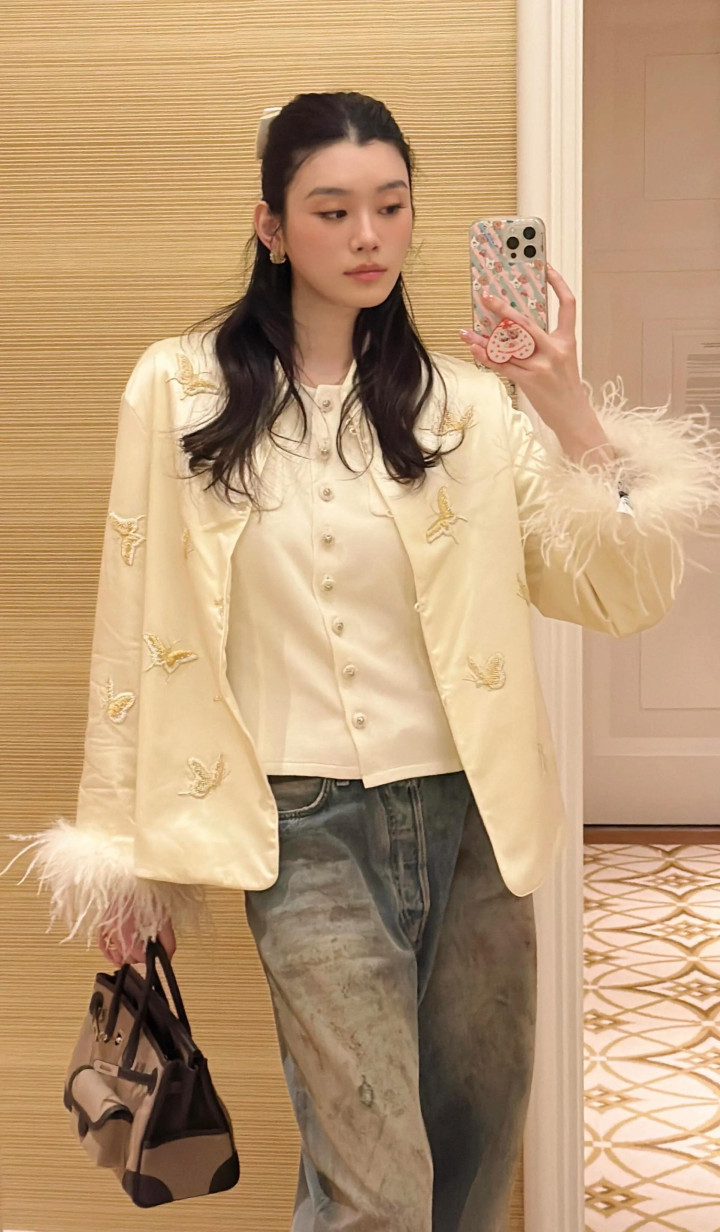 奚梦瑶的新年衣服是一件白色刺绣的新收用,袖口是鸵鸟毛贪图,衣服上绣满了蝴蝶,她用新收用搭配脏脏的牛仔裤,中西结合的穿搭还挺排场的。奚梦瑶用新收用搭配爱马仕包,贵气加倍。奚梦瑶扎了白色蝴蝶结,这身新年造型真漂亮,一看即是很招婆婆心爱的穿搭。她的好意思甲作念的也排场,显平直指皎白修长,很有贵妇范儿。