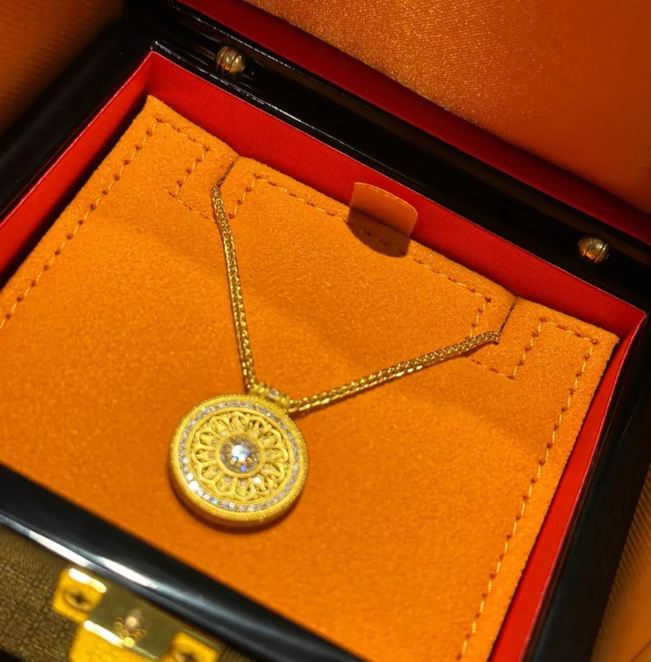 奚梦瑶也爱上戴黄金了,她脖子上的这条项链是老铺黄金的,黄金圆盘上缀满了碎钻,这条项链很贵气百搭。