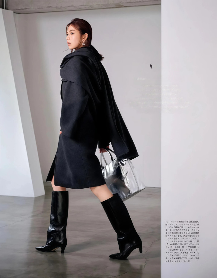 早春穿长靴搭大衣,靴筒版型最要命,紧身长靴贴着腿裹上去,你的腿唯一不够直不够细,腿型的每一处不齐备齐会呈出来;而靴筒太宽松,膝盖以下这一段料子堆在那儿起褶子,步碾儿的时辰很松垮,跟大衣的大要完全不是一个路数。