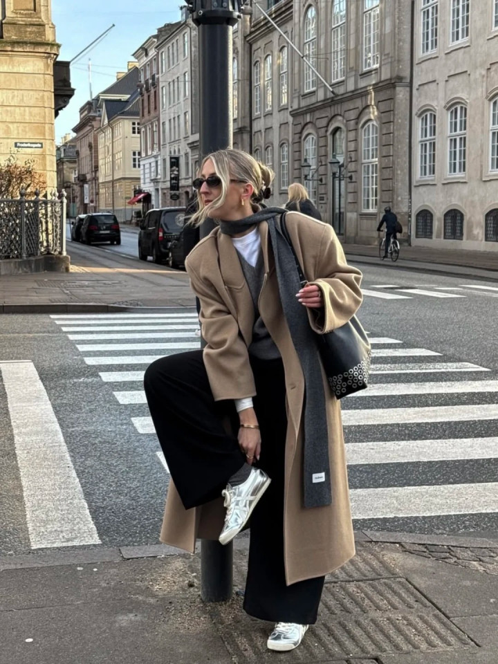 腰线一朝提上去,你从腰到脚的距离变长了,大衣配德训鞋容易出现的那种迟滞、要点偏低的问题也惩处了,你穿的是阔腿裤如故牛仔裤,这一步齐别省。