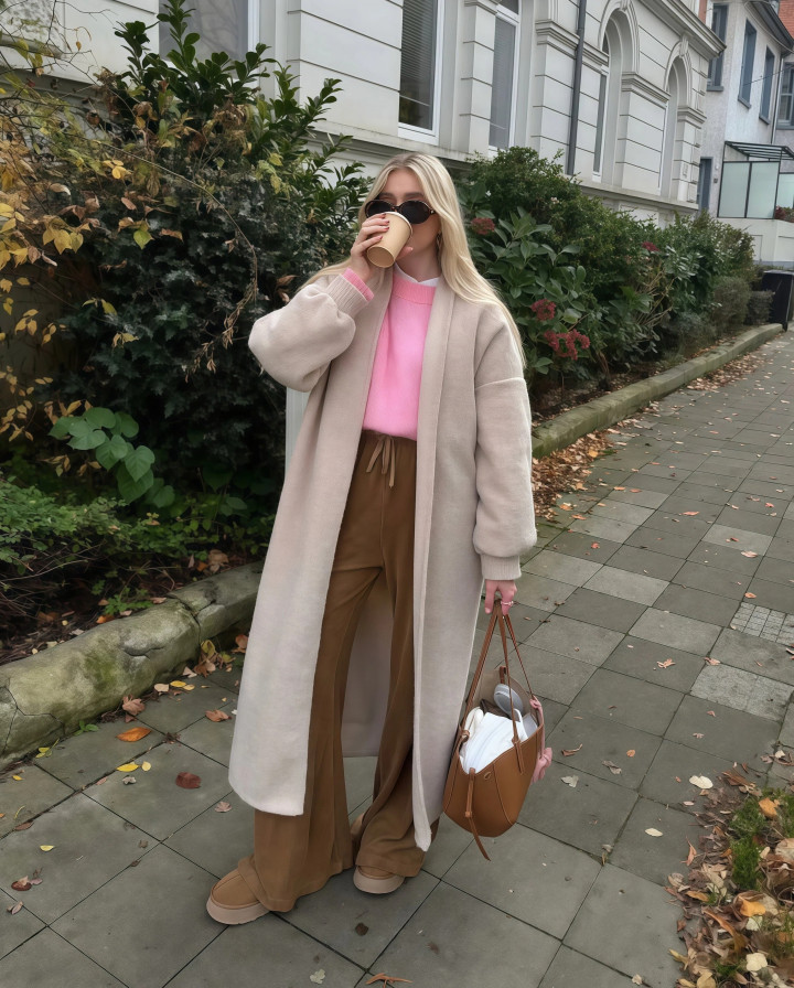 阔腿裤的裤管还能盖住雪地靴的靴口,你无须回来靴筒截腿的问题,裤子当然地垂到鞋面,下半身从大衣下摆到脚的概括保合手一条顺畅的竖线,这是雪地靴搭大衣最值得记取的配法。