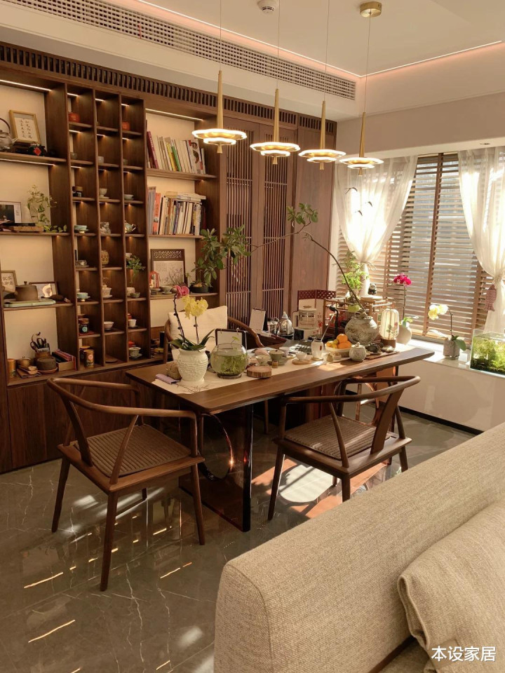 把客厅与相邻的次卧买通,改形成灵通式的茶馆[书斋],局部融入新考中元素,而胡桃木的温润,在相沿的朵云灯的衬托下,营造出一个千里静,又不失任意感的空间氛围。