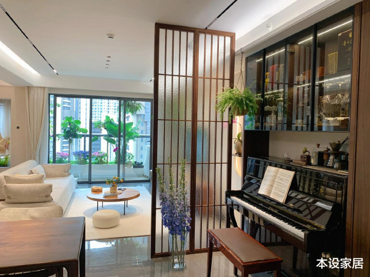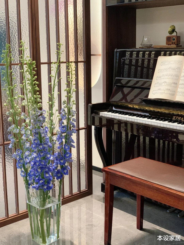 玄关和客厅间置入一架优雅的玄色钢琴,不经意间让糊口多了几分诗意与安详。