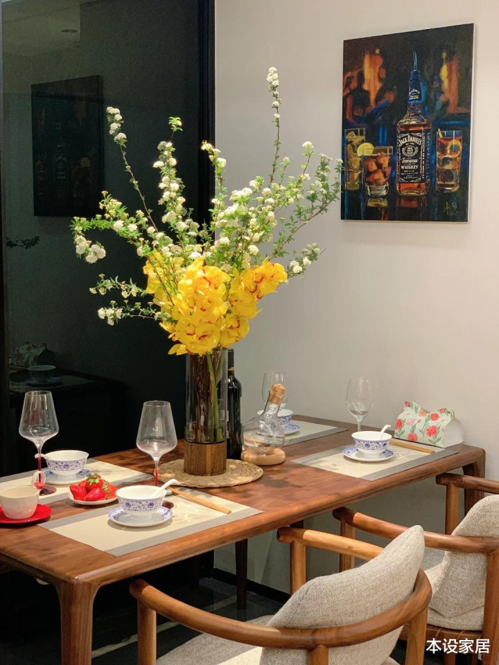 钢琴的对面是餐厅和厨房,不时了合座的从简格调,实木餐桌椅和暖黄色的鲜花,让每一次的视角退换,王人是格调的当然过渡。