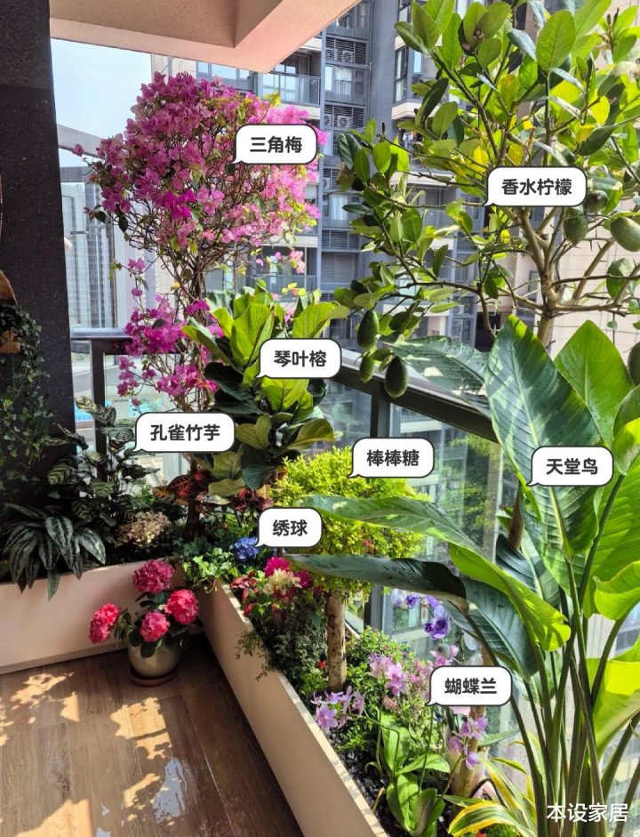 同期,她还定制6个白色花箱,围绕阳台扶手莳植三角梅、琴叶榕、香水柠檬、绣球、天国鸟、霸王蕨、孔雀竹芋等绿植,呈现出一幅祈望盎然的表象。