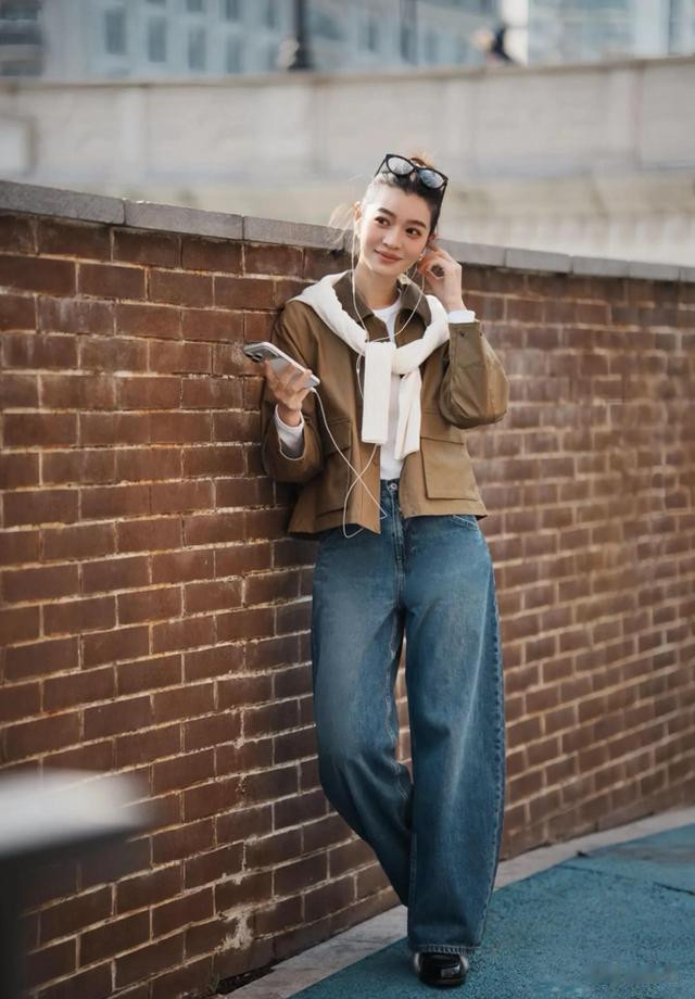 公式:短卡其外衣+白T+牛仔阔腿,上短下长,3:7比例,一秒把五五身拉成三七。