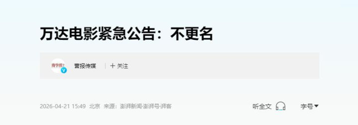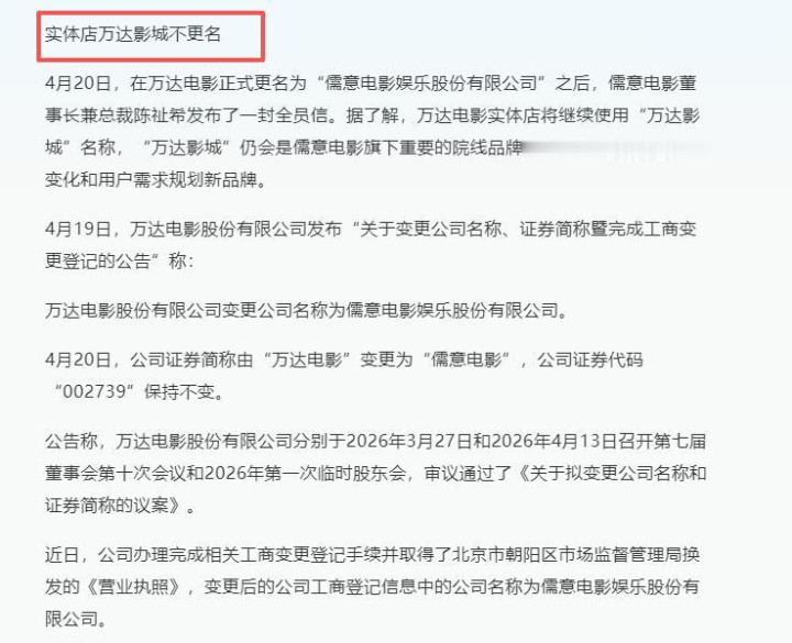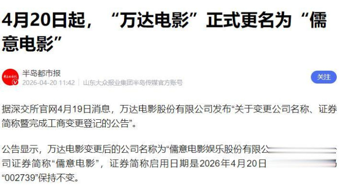 据证券时报2026年4月20日官方报谈,万达电影完成工商变更,证券简称进展由“万达电影”变更为“如意电影”,如意系已全面掌控公司规画方案,王健林过火关联方彻底退出推进行列。