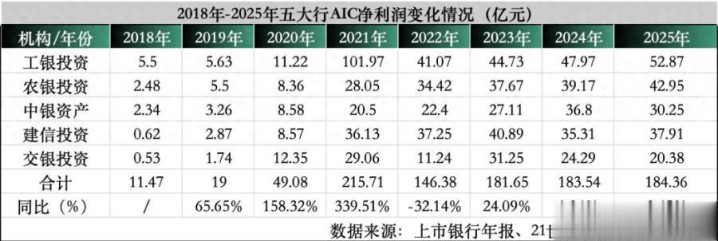 年报数据夸耀,2025年五大行AIC悉数净利润为184.36亿元,同比增速从去年的1.04%进一步放缓至0.45%。尽管近两年增速有所放缓,但自2017年景立以来,5家金融AIC悉数净利润从2018年末的11.47亿元增长至2025年末的184.36亿元,增长了15倍。