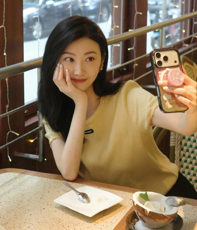 拍照的所在是一家咖啡店,她的桌子上有摆放了一份椰子碗冰激凌,死后的窗户上,挂满了小彩灯。